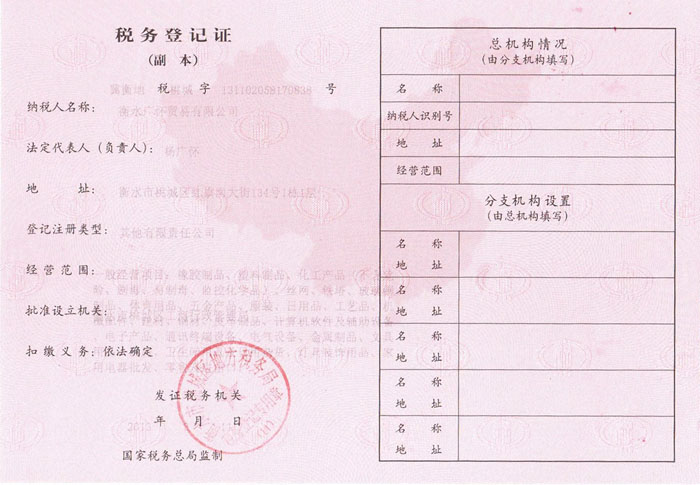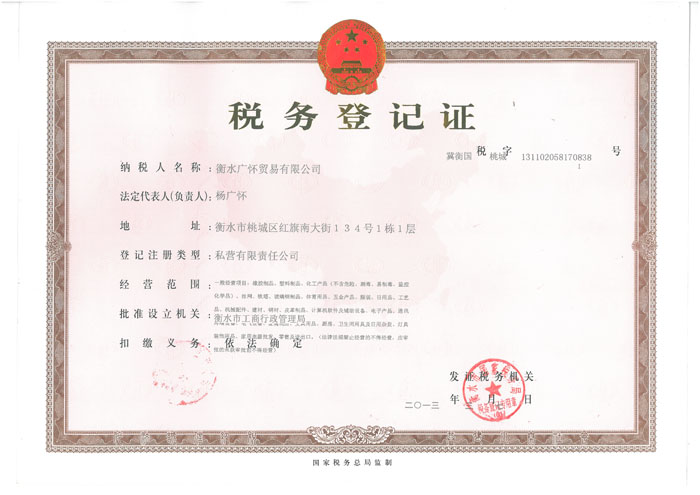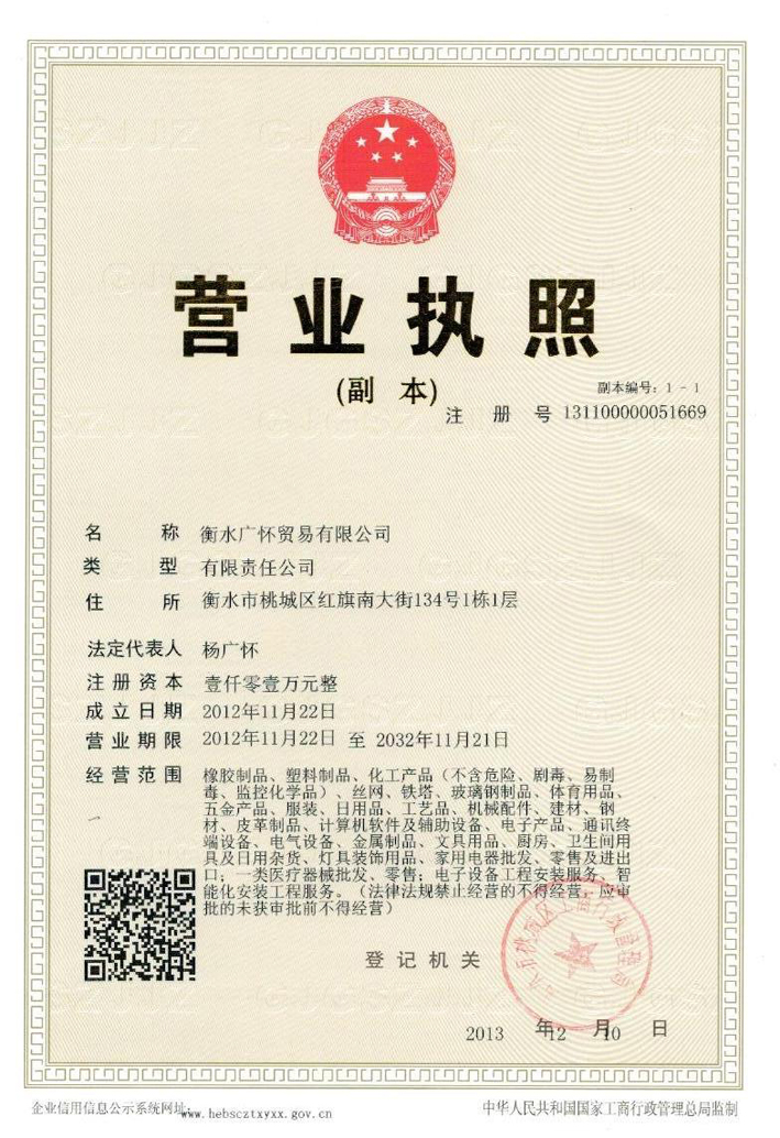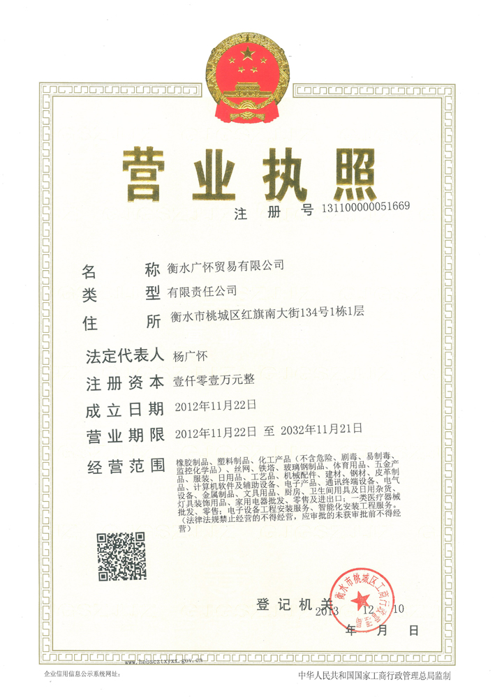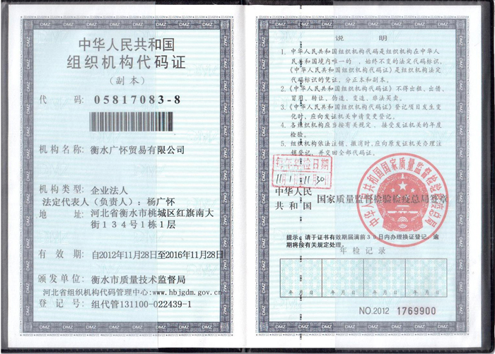 衡水广怀贸易有限公司企业法人营业执照(正本) 衡水广怀贸易有限公司企业法人营业执照(副本) 衡水广怀贸易有限公司税务登记证地税(正本) 衡水广怀贸易有限公司税务登记证地税(副本) 衡水广怀贸易有限公司税务登记证国税(正本) 衡水广怀贸易有限公司税务登记证国税(副本) 衡水广怀贸易有限公司组织机构代码证(正本) 衡水广怀贸易有限公司组织机构代码证(副本)