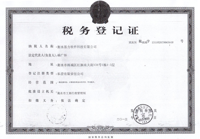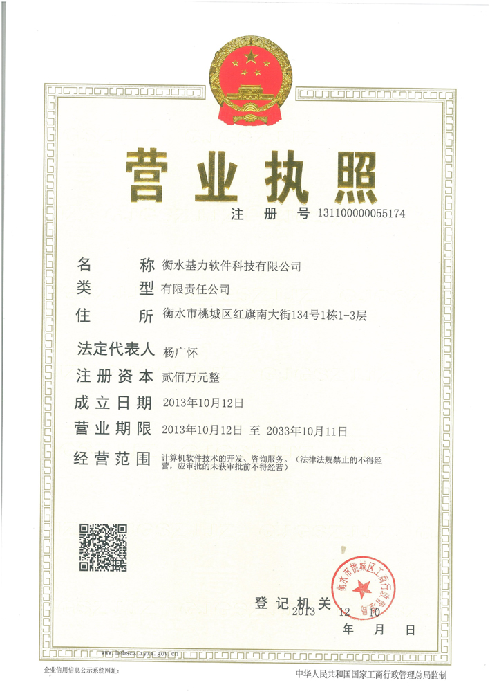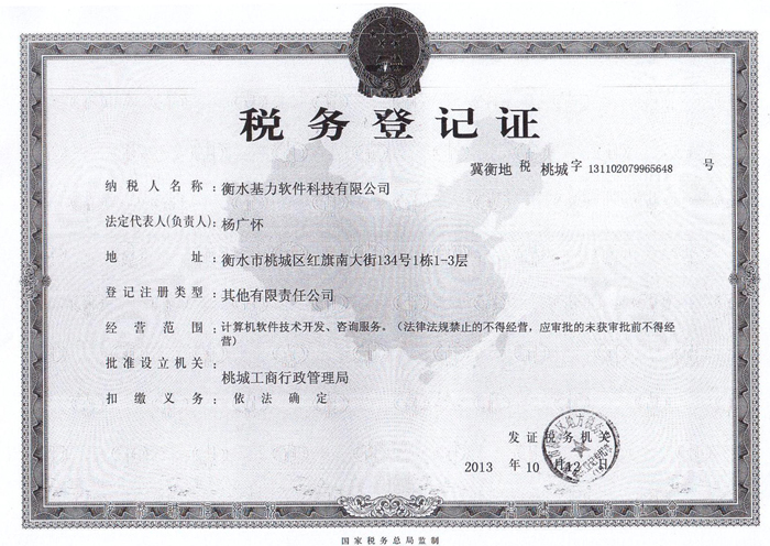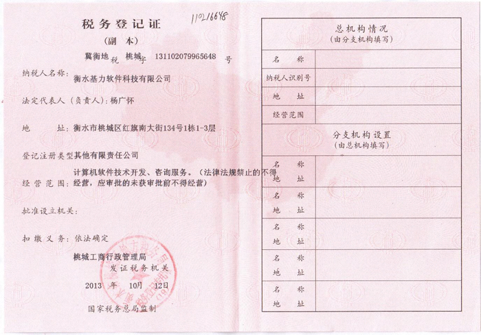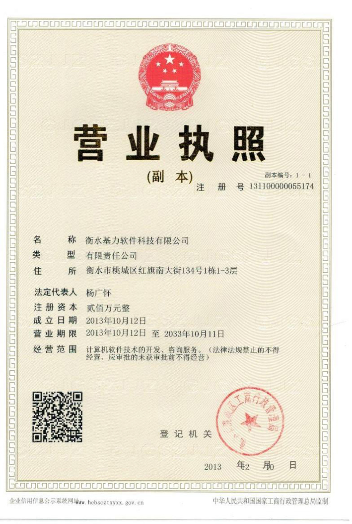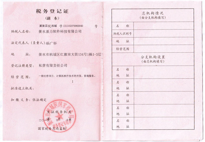 衡水基力软件科技有限公司企业法人营业执照(正本) 衡水基力软件科技有限公司企业法人营业执照(副本) 衡水基力软件科技有限公司税务登记证(国税正本)衡水基力软件科技有限公司税务登记证(国税副本) 衡水基力软件科技有限公司税务登记证(地税正本) 衡水基力软件科技有限公司税务登记证(地税副本) 衡水基力软件科技有限公司组织机构代码证(正本) 衡水基力软件科技有限公司组组织机构代码证(副本)